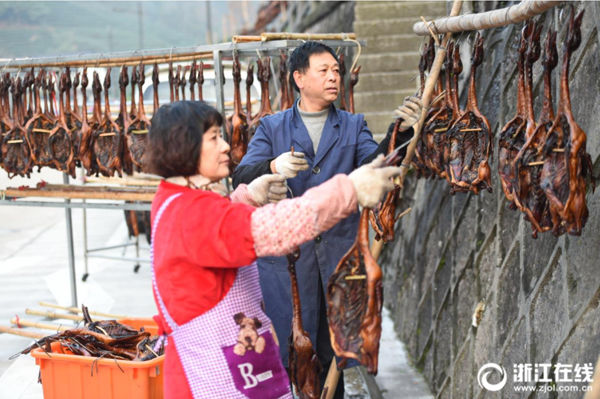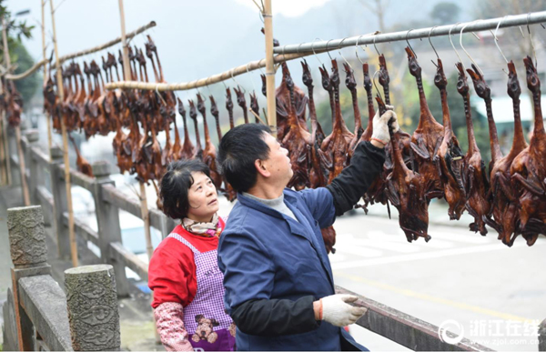 梅守建家做醬鴨有20多年了,以前許多游客到他家開的農(nóng)家樂吃飯,特別喜歡點(diǎn)醬肉蒸春筍、千張筍干蒸醬鴨等幾道菜,有的臨走還捎帶一些醬貨回去,送給親朋好友品嘗。(浙江在線記者 吳元峰 攝)