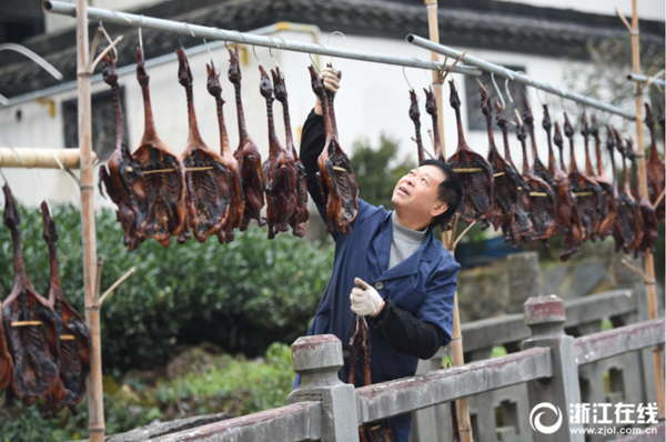 12月12日,杭州大雪過后的第一個(gè)晴天,一大早,西湖區(qū)梅家塢村村民梅守建與妻子一起,把醬肉、醬鴨拿到太陽(yáng)底下去曬。這是他們家第一批自制的醬肉、醬鴨,醬肉做了150多公斤,醬鴨做了150多只,再曬幾個(gè)大太陽(yáng),就可以上市了。
