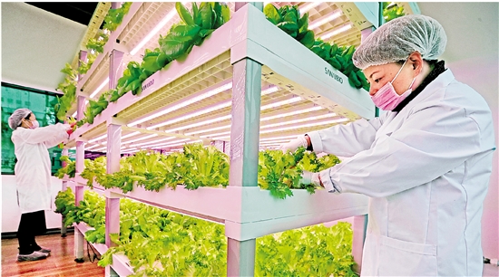 近日,湖州市吳興區(qū)八里店鎮(zhèn)夢(mèng)田源·農(nóng)業(yè)夢(mèng)工廠內(nèi),工作人員正在采摘設(shè)備上的蔬菜。該設(shè)備利用水資源循環(huán)、可再生資源處理等方法,實(shí)現(xiàn)蔬菜立體種植,節(jié)省土地,減少能耗。