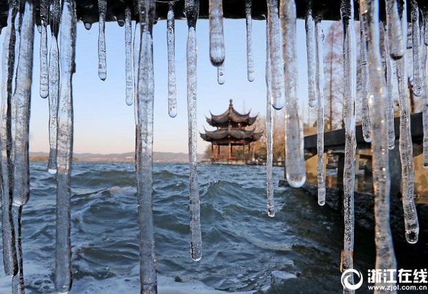 12月29日,杭州最低氣溫達(dá)到-2.4℃,創(chuàng)入冬以來(lái)最低,西湖長(zhǎng)橋掛起一排冰凌,西湖邊的游人也裹起了厚厚的冬裝。(浙江在線記者 林云龍 攝)