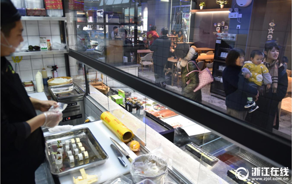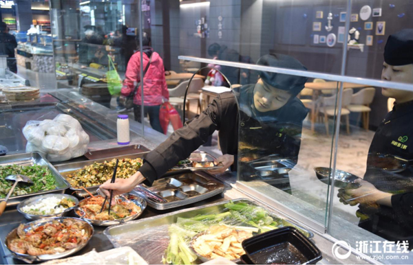 2019年1月3日,杭州駱家莊農(nóng)貿(mào)市場一角彌漫著誘人的海鮮烹飪的香氣,顧客在這里購買生鮮產(chǎn)品后,可以直接委托廚房加工成熟食,這家省級智慧型菜場又插上了“新零售”的翅膀。