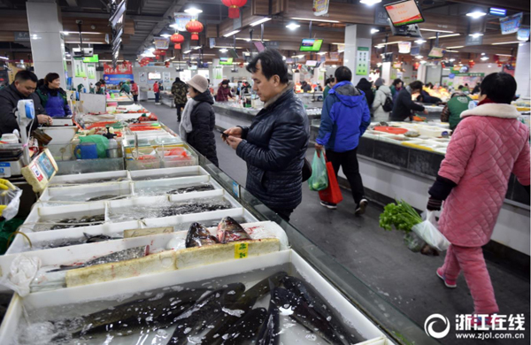 2019年1月3日,杭州駱家莊農(nóng)貿(mào)市場一角彌漫著誘人的海鮮烹飪的香氣。