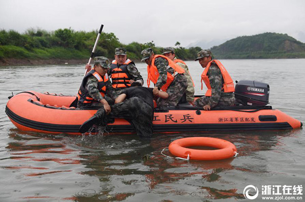 5月15日,杭州臨安區(qū)潛川鎮(zhèn),基層黨員、民兵進(jìn)行沖鋒舟救援技能訓(xùn)練。