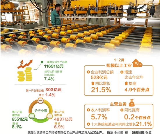浙江經(jīng)濟(jì)一季度成績單4月23日出爐。全省生產(chǎn)總值達(dá)11691億元,同比增長7.4%。分產(chǎn)業(yè)看,第一產(chǎn)業(yè)增加值303億元,增長1.4%;第二產(chǎn)業(yè)增加值4837億元,增長6.9%;第三產(chǎn)業(yè)增加值6551億元,增長8.1%。