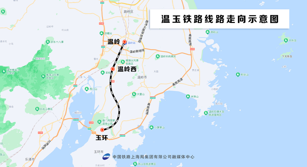溫玉鐵路位于浙江省臺(tái)州市南部,行經(jīng)溫嶺、玉環(huán)兩市。線路自杭臺(tái)高鐵溫嶺站引出,經(jīng)溫嶺市溫嶠鎮(zhèn)、塢根鎮(zhèn)、城南鎮(zhèn)和玉環(huán)市清港鎮(zhèn)、楚門鎮(zhèn)、龍溪鎮(zhèn),止于蘆浦鎮(zhèn)玉環(huán)站,設(shè)溫嶺、溫嶺西、玉環(huán)3個(gè)車站,設(shè)計(jì)時(shí)速350公里,新建正線約37公里,其中溫嶺境內(nèi)約21公里,玉環(huán)境內(nèi)約16公里。