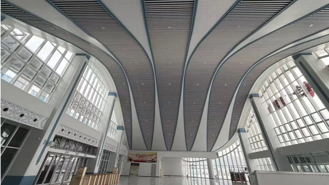 自開工建設(shè)以來,中鐵建設(shè)項目團隊迎難而上,克服臺風季節(jié)、交叉作業(yè)多、鋼屋蓋高低落差大、曲線鋁板檐口造型復雜等不利因素的影響,精心謀劃部署,采取單元模塊多點測量、三維建模,參數(shù)化定制每塊鋁板單元,并研發(fā)出新型波紋腹板先進施工技術(shù),順利完成大跨度弧形屋面板的安裝。