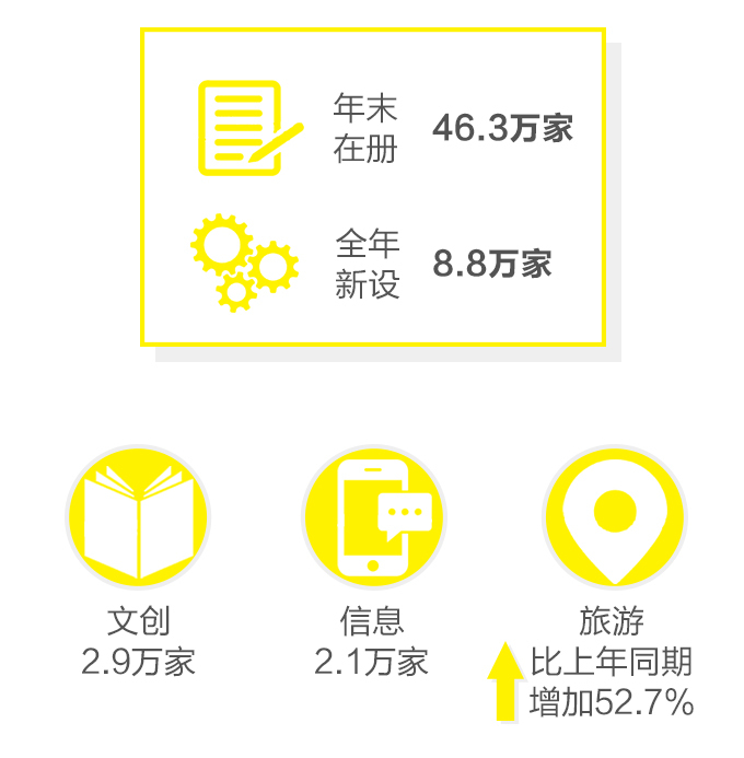 其中,八大重點產(chǎn)業(yè)成長加快,文創(chuàng)、信息、旅游業(yè)增勢較猛。而值得注意的是,小微企業(yè)在其中貢獻尤其突出,除金融、環(huán)保產(chǎn)業(yè)外,八大產(chǎn)業(yè)中小微企業(yè)數(shù)量占比都較其他產(chǎn)業(yè)高。年末在冊八大重點產(chǎn)業(yè)小微企業(yè)總數(shù)達到46.3萬家,全年新設(shè)八大重點產(chǎn)業(yè)小微企業(yè)8.8萬家,文化創(chuàng)意產(chǎn)業(yè)和信息經(jīng)濟產(chǎn)業(yè)分別達到2.9萬家、2.1萬家,旅游產(chǎn)業(yè)增速最高,比上年同期多增加了52.7%。