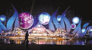 巨型的荷花舞臺漂浮在西湖之上,同不遠處真正的田田荷葉們交相輝映。舞臺正中是一顆珍珠,巨大的“荷花瓣”,錯落分布有大大小小的九個圓形彩色屏幕,老西湖十景、新西湖十景、三評西湖十景共30處西湖景點會在九個彩幕上交替出現(xiàn),全景式、全方位打造人間天堂。