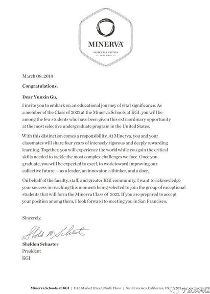(顧韻欣同學收到的密涅瓦大學錄取通知書)
